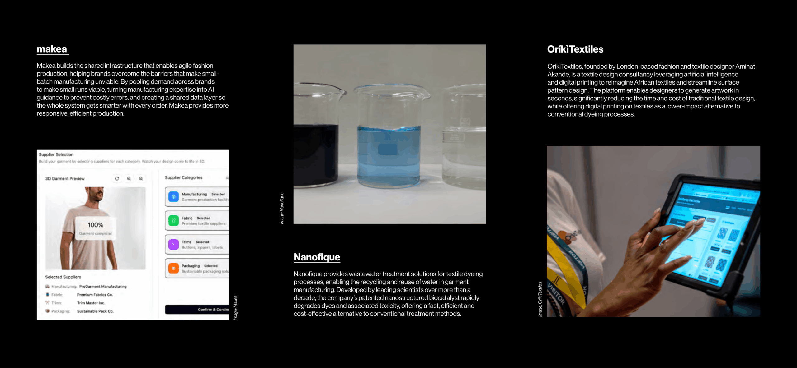 OríkìTextiles, founded by London-based fashion and textile designer Aminat Akande, is a textile design consultancy leveraging artificial intelligence and digital printing to reimagine African textiles and streamline surface pattern design. The platform enables designers to generate artwork in seconds, significantly reducing the time and cost of traditional textile design, while offering digital printing on textiles as a lower-impact alternative to conventional dyeing processes.