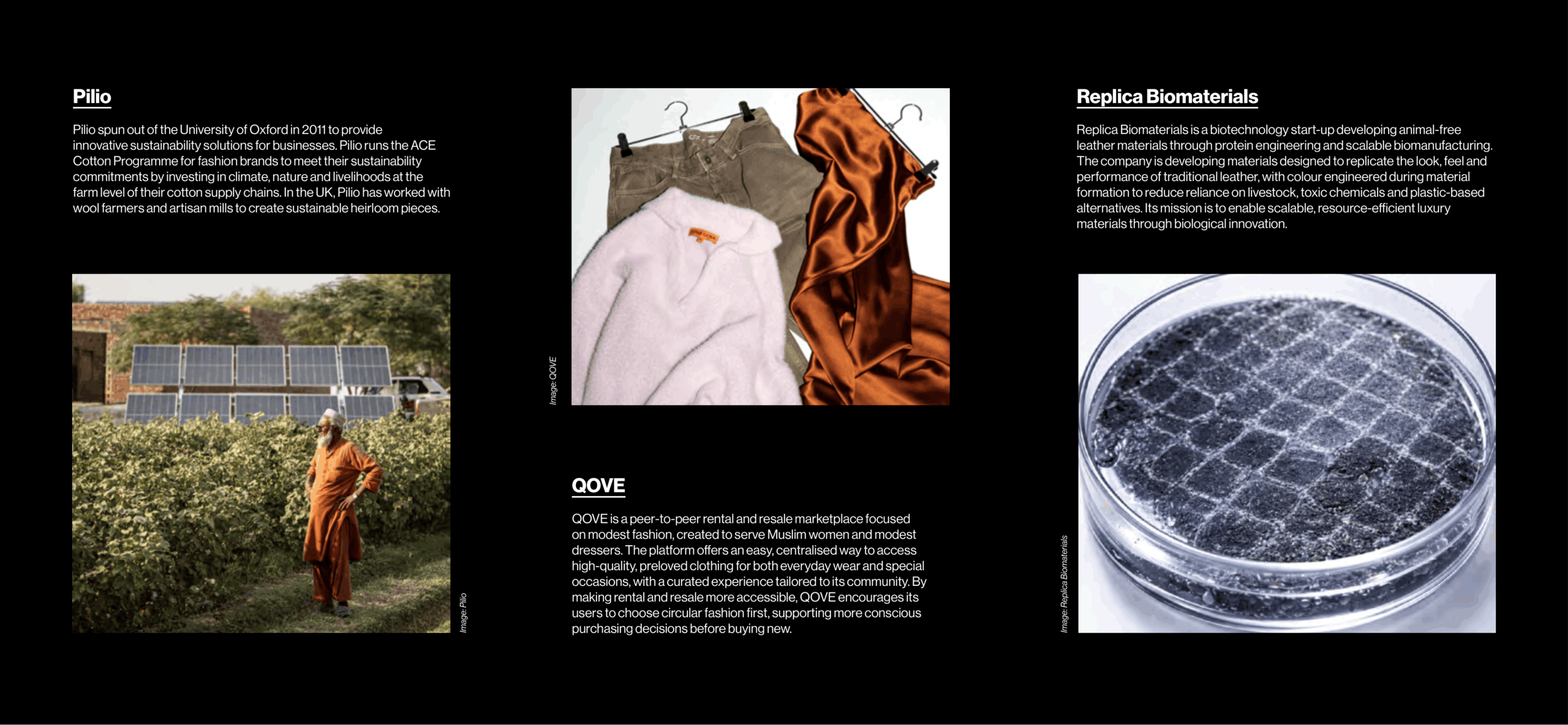 Replica Biomaterials is a biotechnology start-up developing animal-free leather materials through protein engineering and scalable biomanufacturing. The company is developing materials designed to replicate the look, feel and performance of traditional leather, with colour engineered during material formation to reduce reliance on livestock, toxic chemicals and plastic-based alternatives.