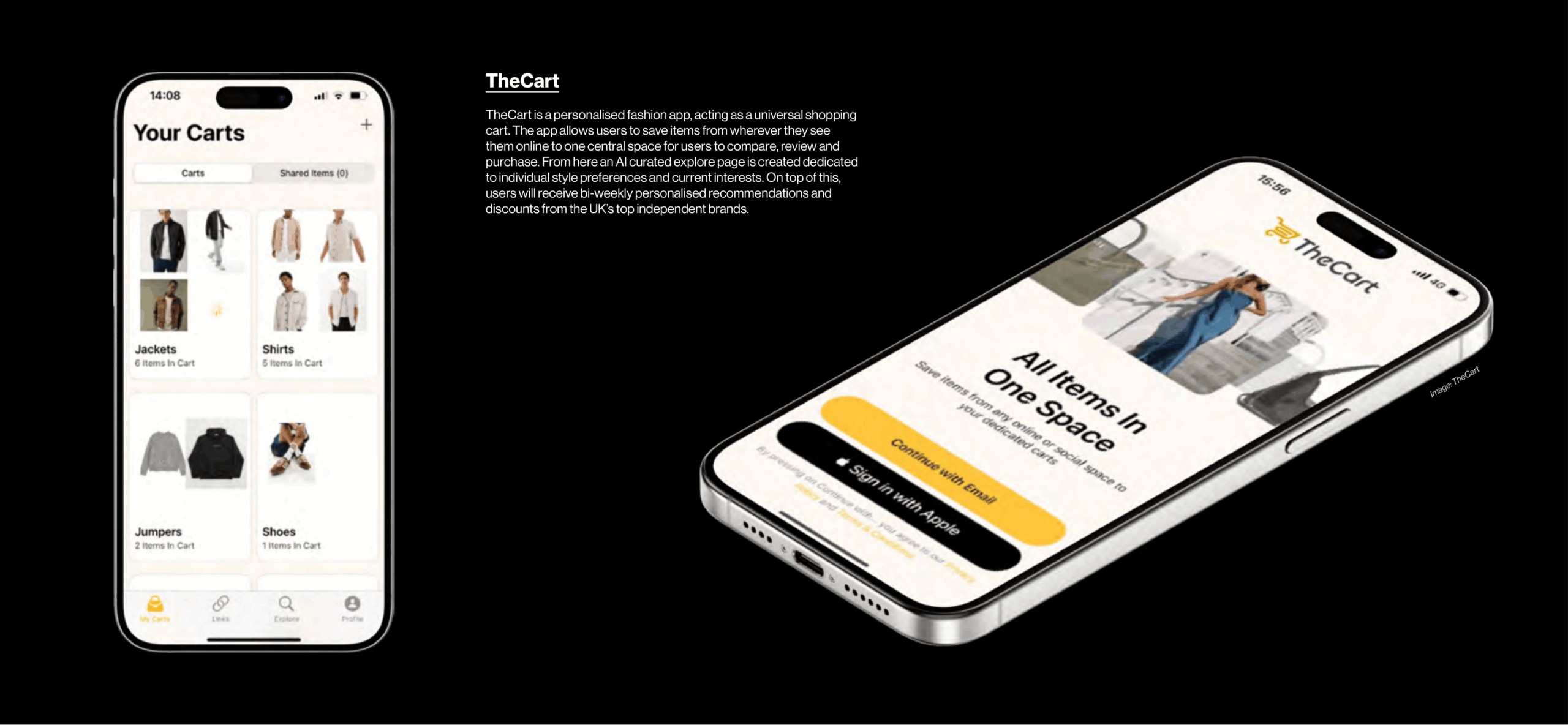 TheCart is a personalised fashion app, acting as a universal shopping cart. The app allows users to save items from wherever they see them online to one central space for users to compare, review and purchase. From here an AI curated explore page is created dedicated to individual style preferences and current interests. On top of this, users will receive bi-weekly personalised recommendations and discounts from the UK’s top independent brands.