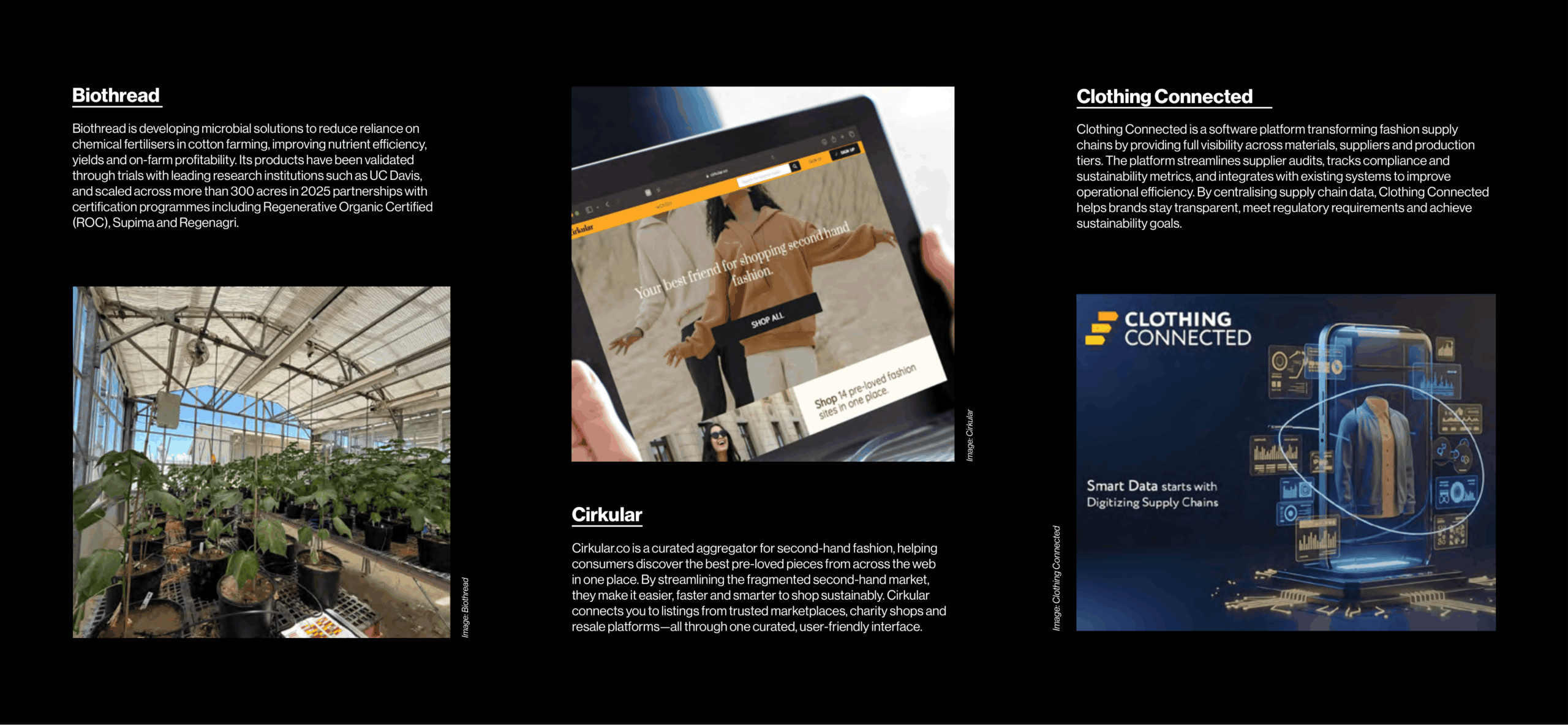 Clothing Connected is a software platform transforming fashion supply chains by providing full visibility across materials, suppliers and production tiers. The platform streamlines supplier audits, tracks compliance and sustainability metrics, and integrates with existing systems to improve operational efficiency. By centralising supply chain data, Clothing Connected helps brands stay transparent, meet regulatory requirements and achieve sustainability goals.